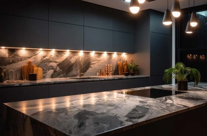 Deep charcoal, navy, espresso, and even jet-black countertops have become quite mainstream. These rich, moody tones create a stunning contrast against light cabinetry, natural woods, and coastal palettes. Dark surfaces bring sophistication and anchor open-concept spaces with a strong visual presence.